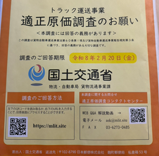 1月にみなさんの営業所にオレンジかピンクの封筒で「適正原価調査のお願い」が届いたと思います。期限は2月20日または27日までです。書くのは大変ですが運送業界の未来を決める大切なアンケートです。ぜひ自社にとっての適正な原価を訴えてください!
